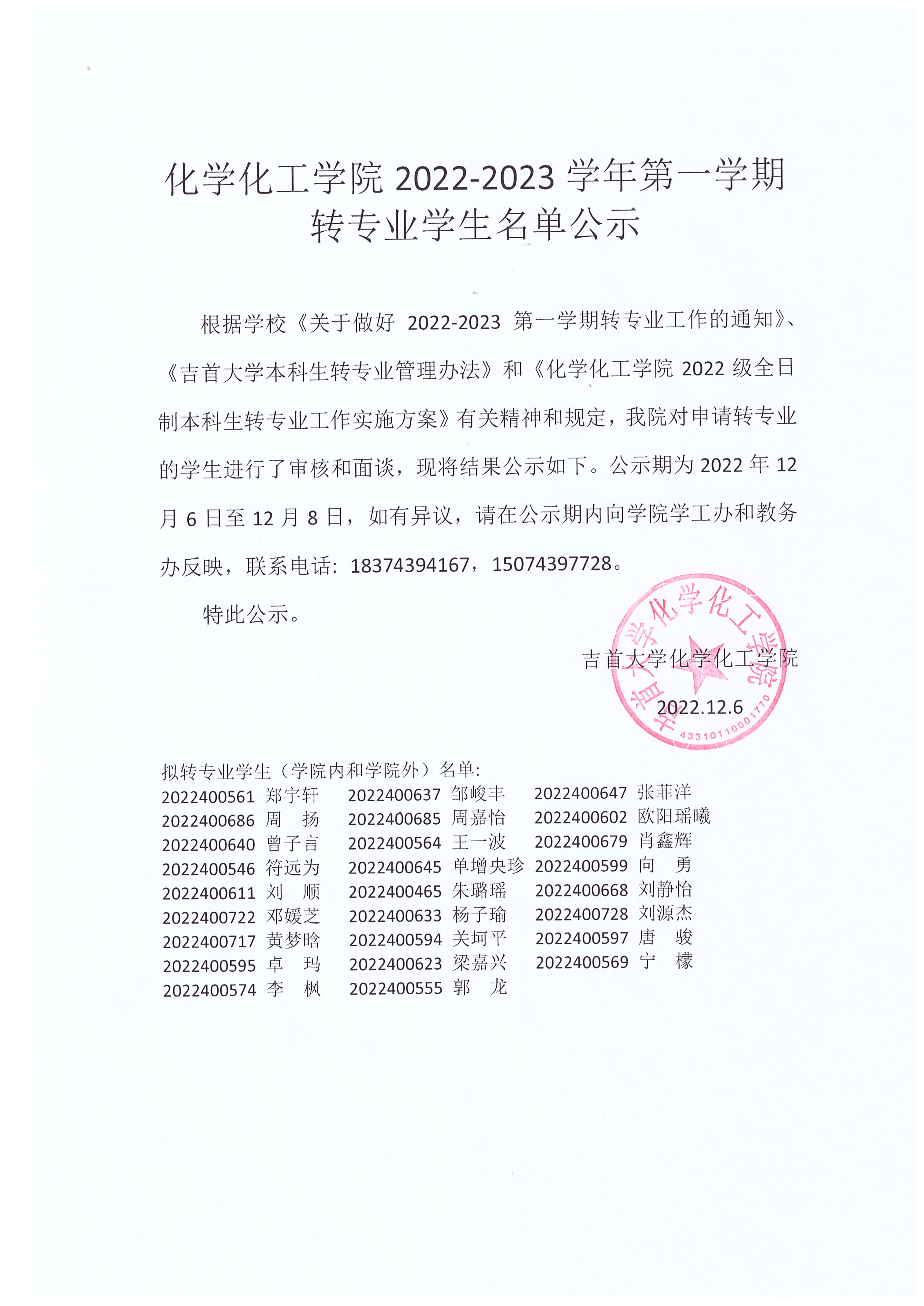 William威廉英国2022-2023学年第一学期转专业学生名单公示